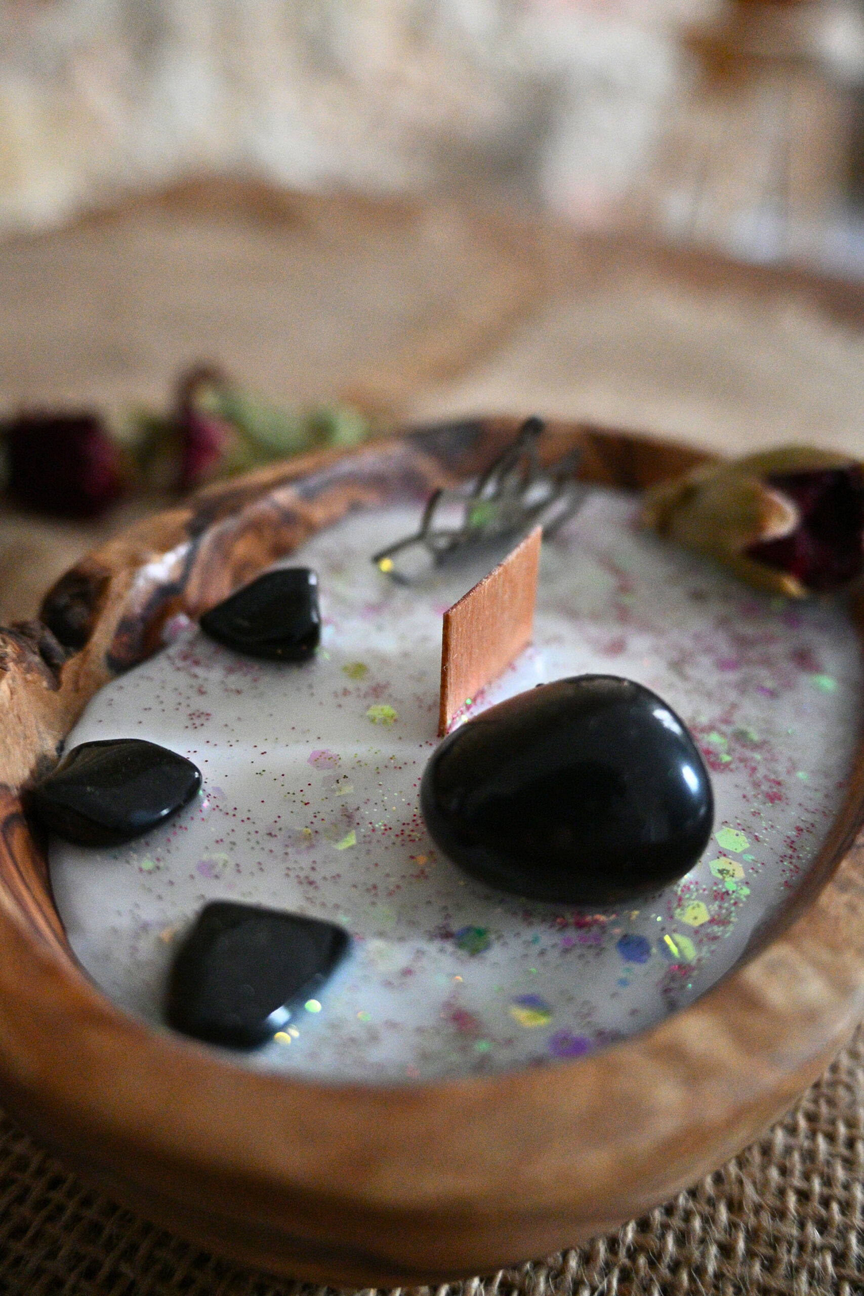 Cette bougie se compose de cire de soja européenne 100% végane et cruelty free, de pierres naturelles et d’huile essentielle.