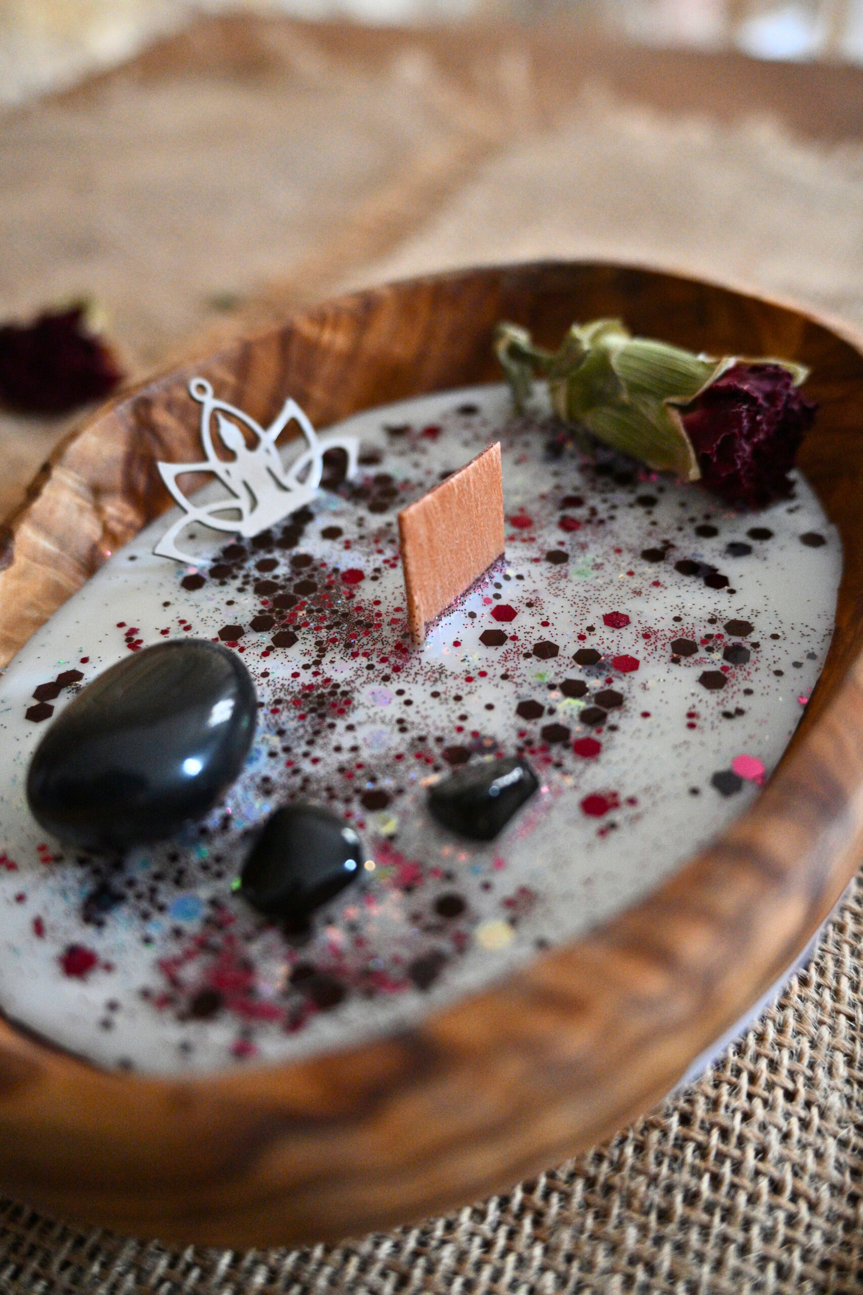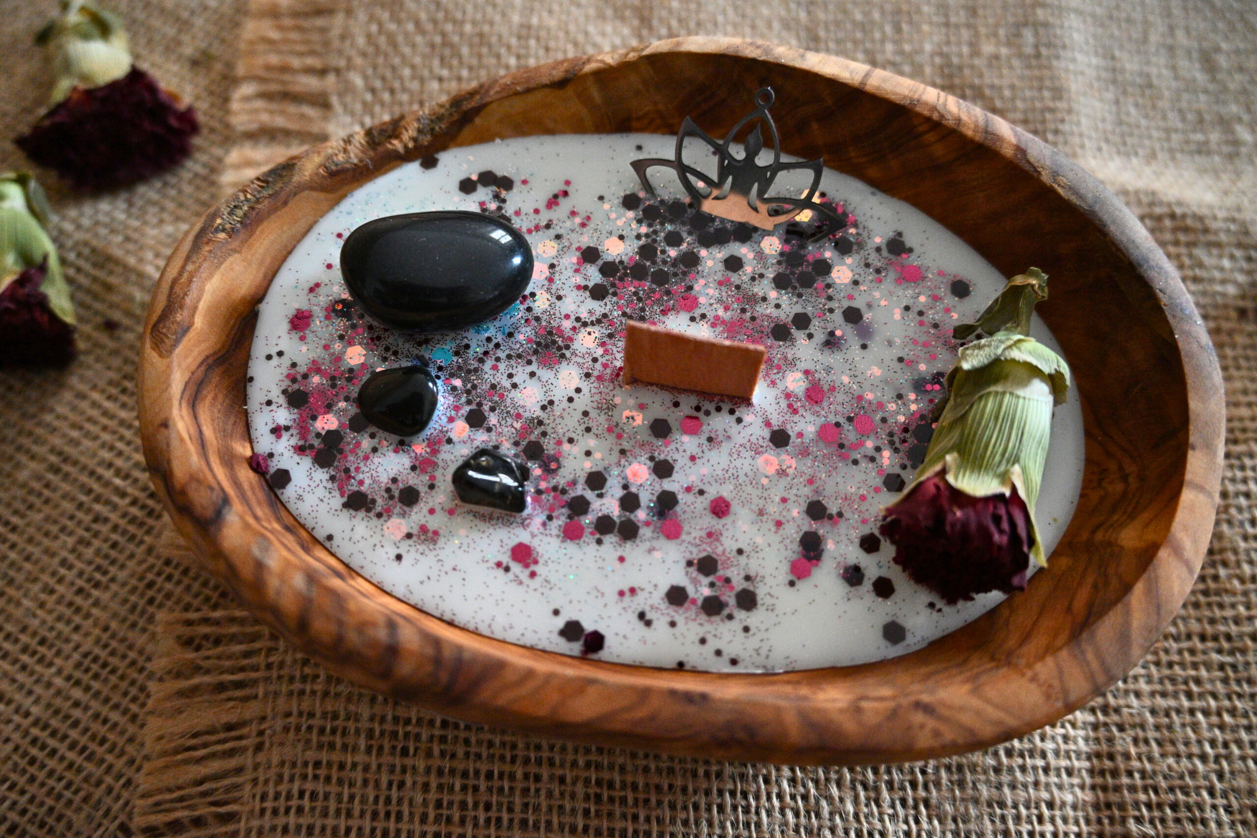 Cette bougie se compose de cire de soja européenne 100% végane et cruelty free, de pierres naturelles et d’huile essentielle.