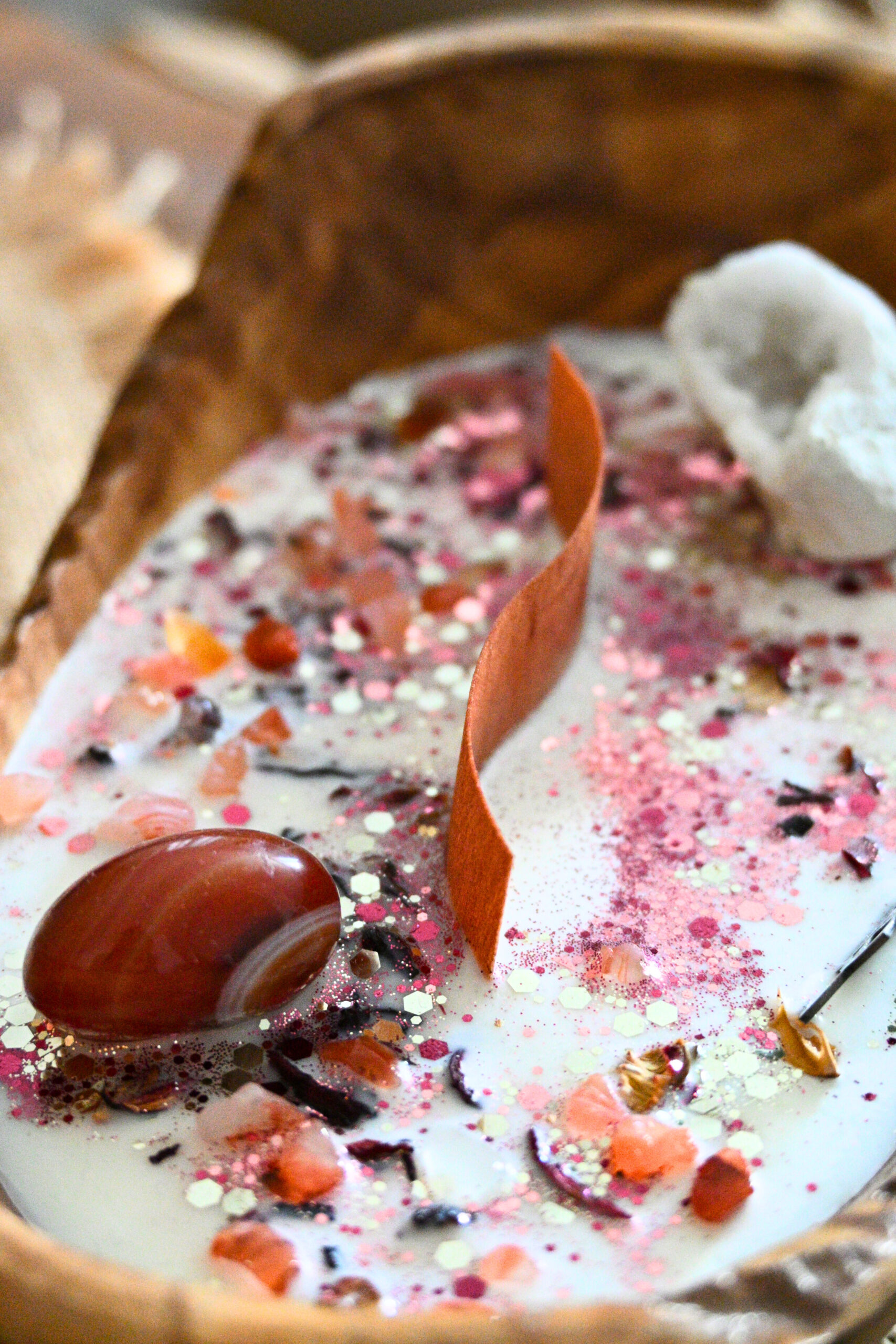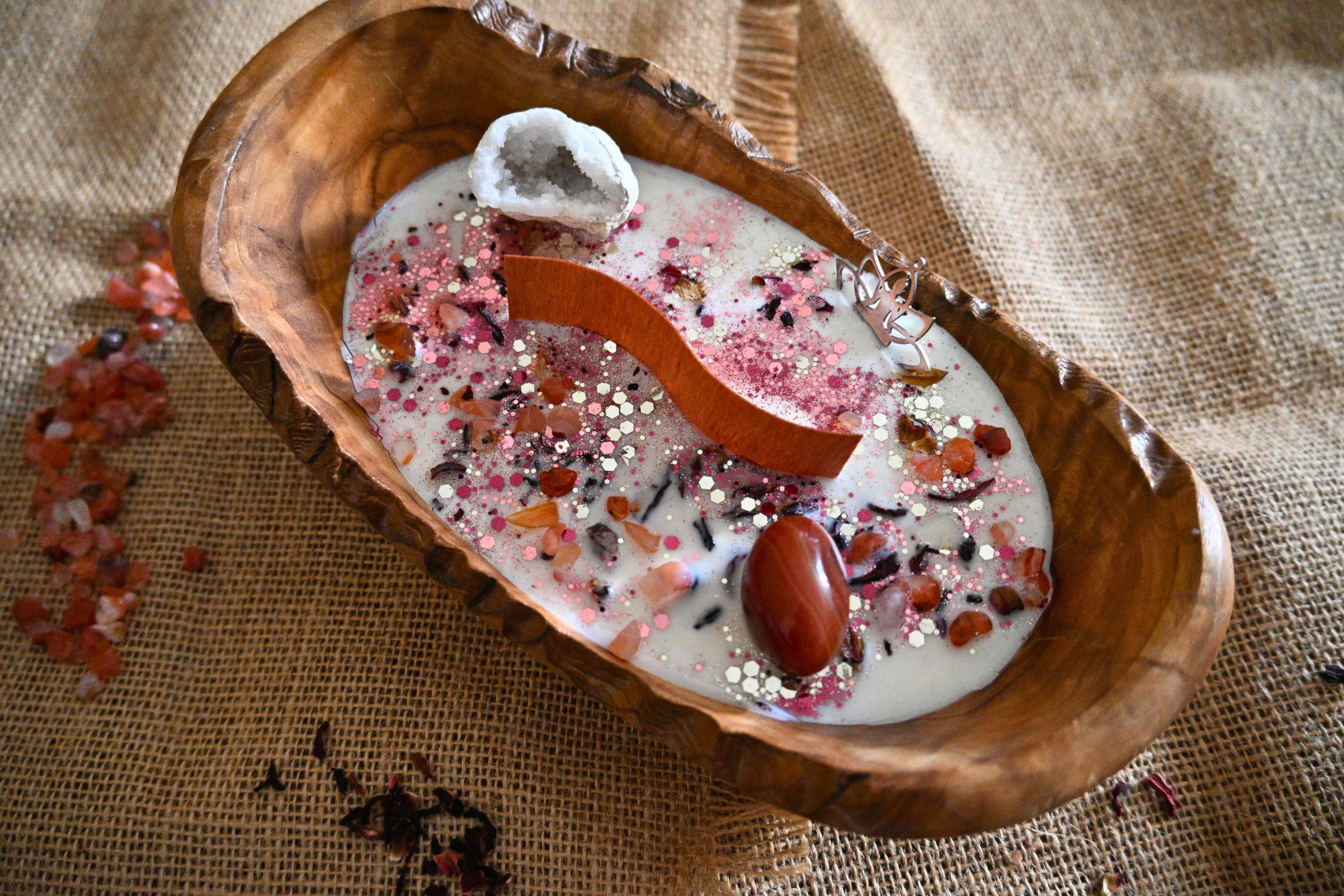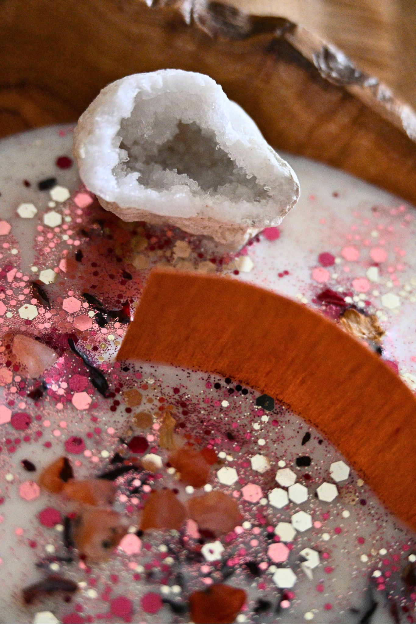 Cette bougie se compose de cire de soja européenne 100% végane et cruelty free, de pierres naturelles et d’huile essentielle.