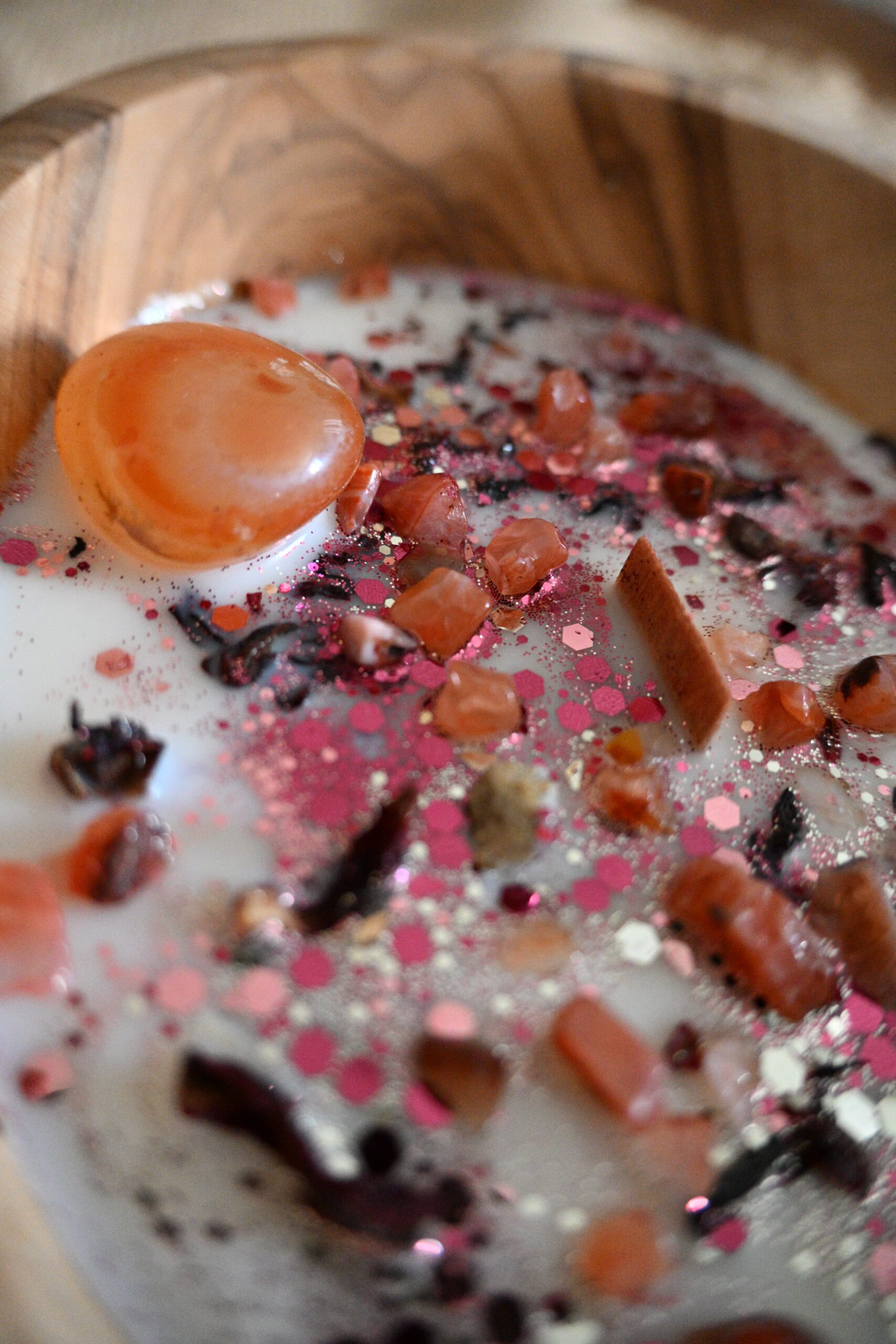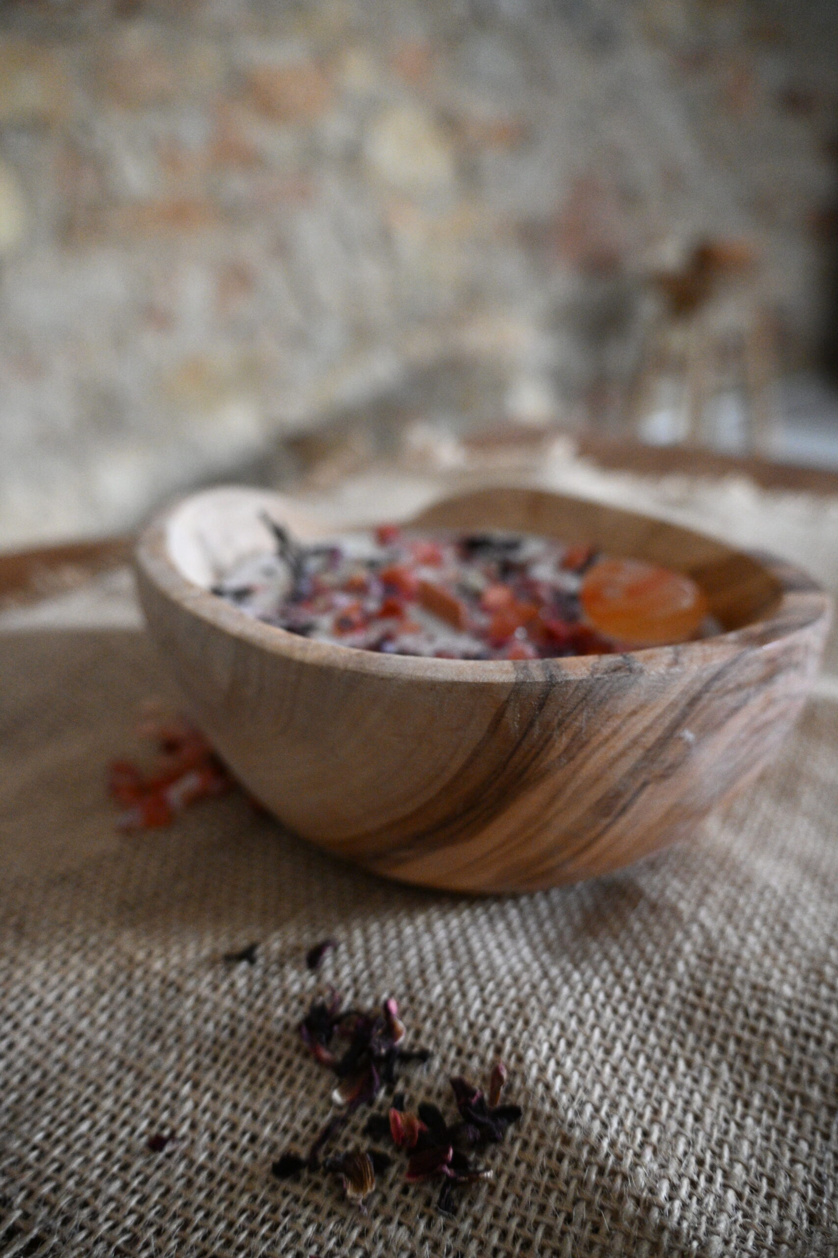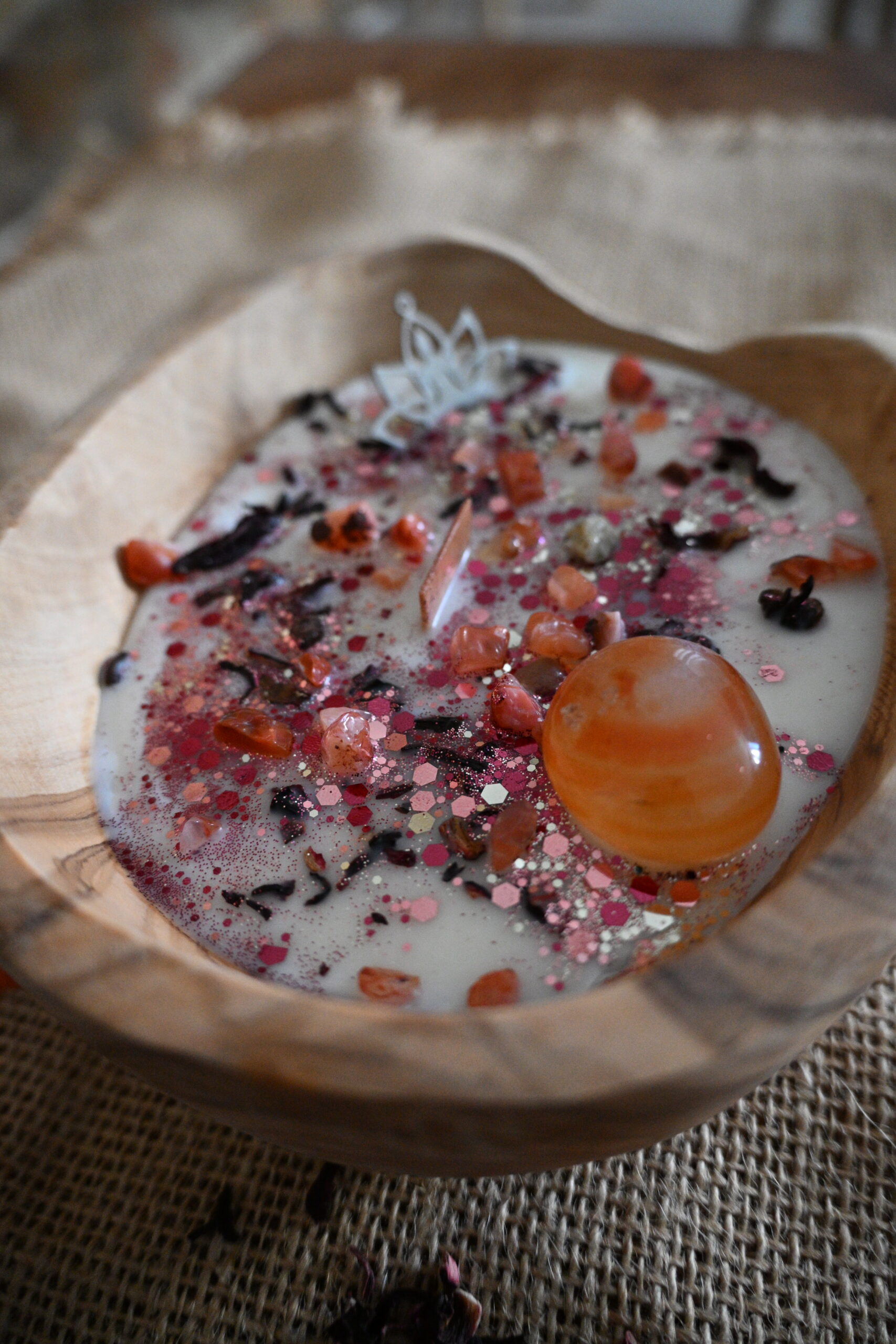 Cette bougie se compose de cire de soja européenne 100% végane et cruelty free, de pierres naturelles et d’huile essentielle.