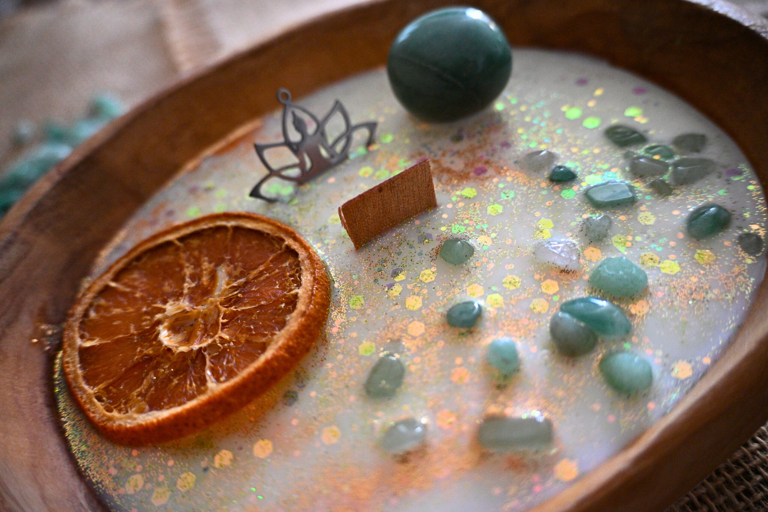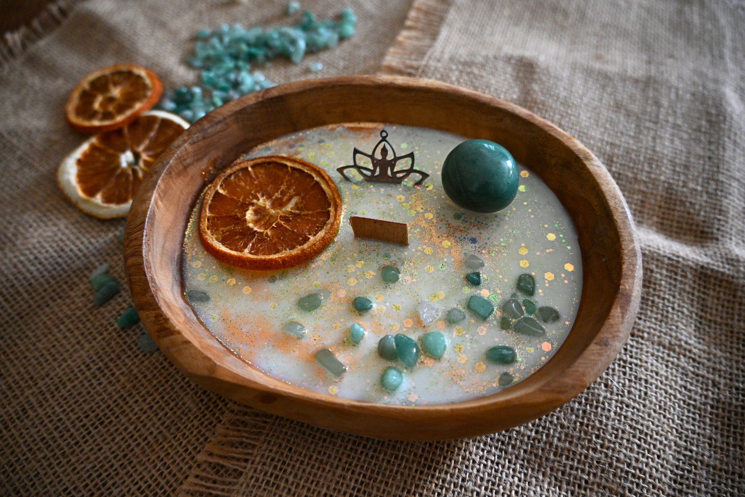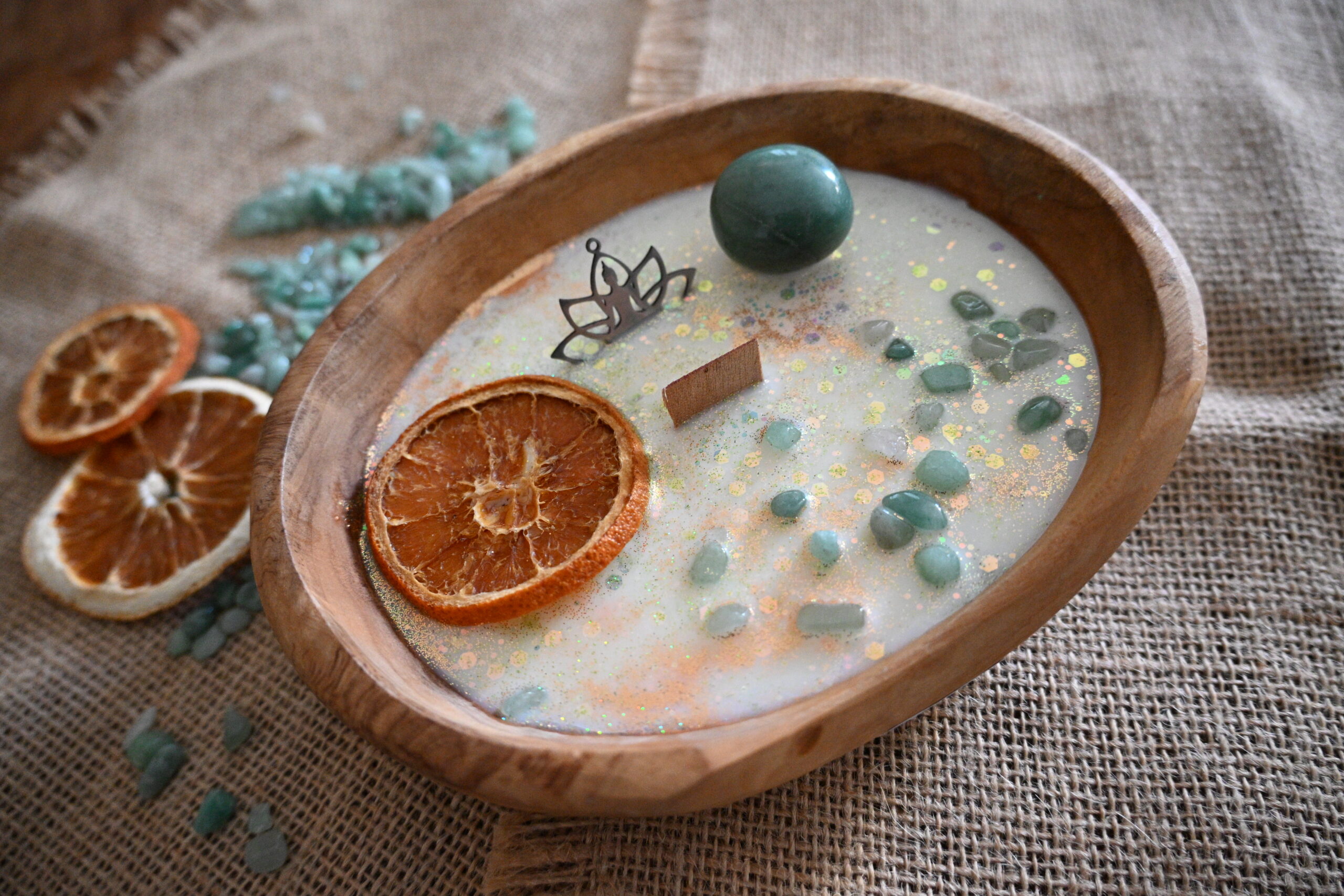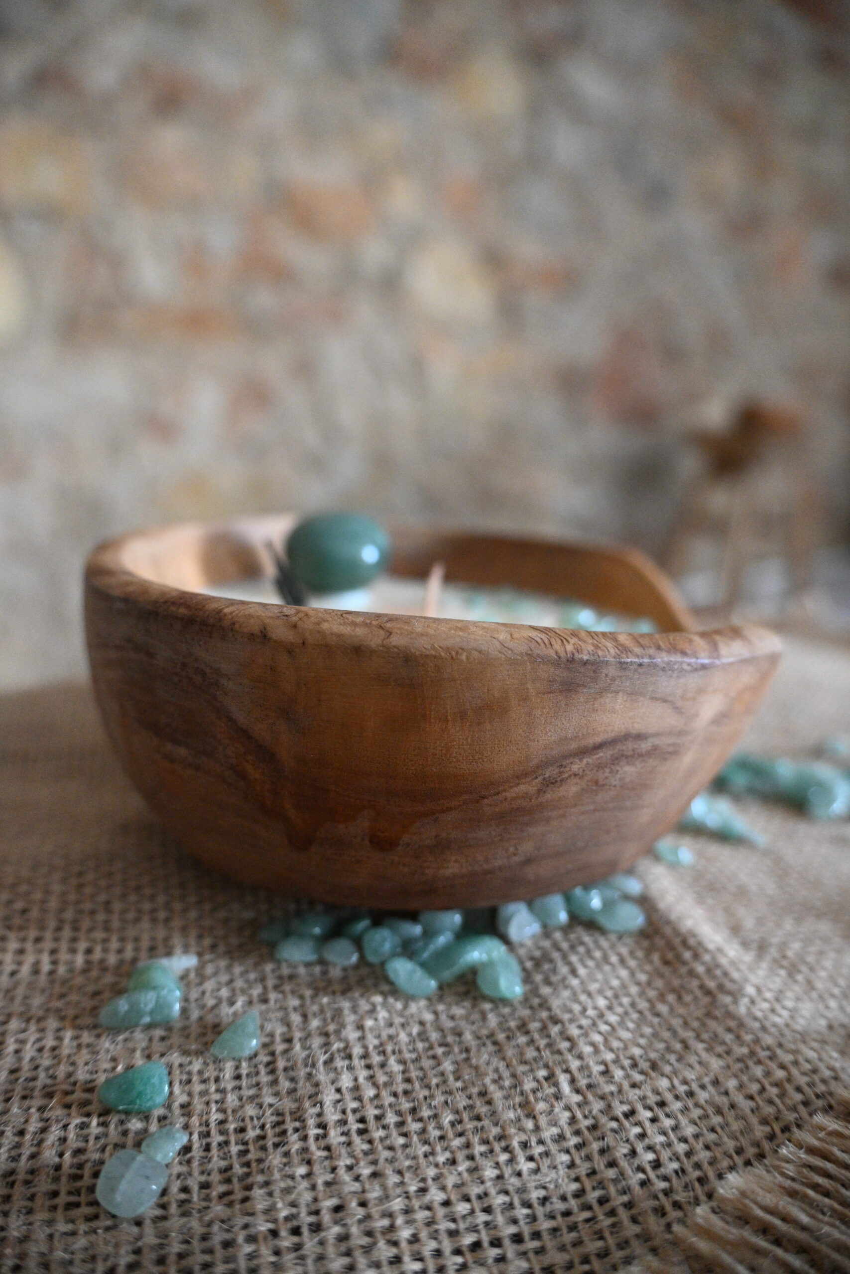 Cette bougie se compose de cire de soja européenne 100% végane et cruelty free, de pierres naturelles et d’huile essentielle.
